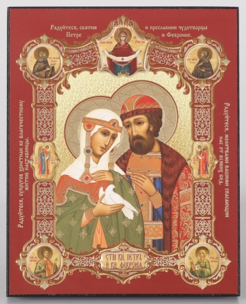 Икона на деревянном планшете 13х18 конгрев, плёнка (18мм) Петр и Феврония 7 (с клеймами)