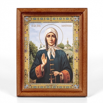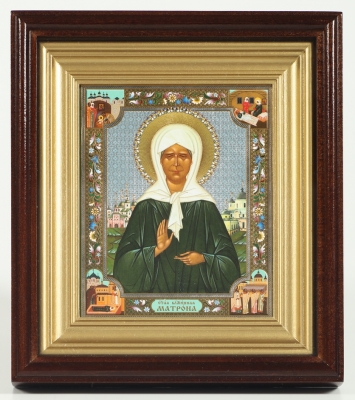 Икона в киоте 11х13 сложный, двойное тиснение Матрона с клеймами