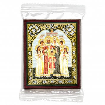 Икона на деревянном планшете 6х9 двойное тиснение, аннотация, упаковка Царская семья