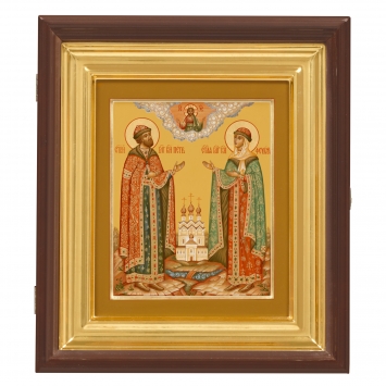 Икона живописная на доске в киоте 18х24 темпера, золоченый нимб, ковчег, киот №1 Петр и Феврония, 05630