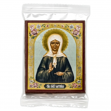 Икона на деревянном планшете 6х9 двойное тиснение, аннотация, упаковка Матрона Московская (с клеймами)