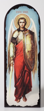Икона на МДФ 18х50 арочная, объёмная печать, лак Архангел Михаил