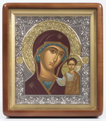 Икона в киоте 18х24 фигурный, темпера, риза никель, золочёный венчик Казанская БМ