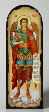 Икона на МДФ 18х50 арочная, объёмная печать, лак Архангел Михаил 2