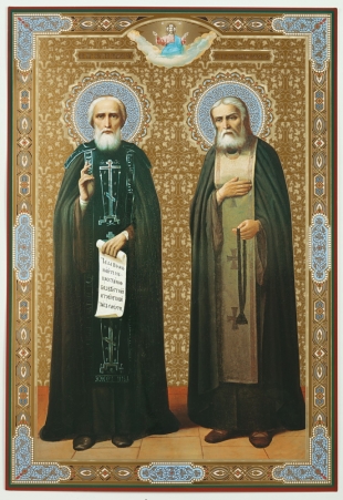 Икона на оргалите №1 30х40 двойное тиснение Сергий Радонежский и Серафим Саровский