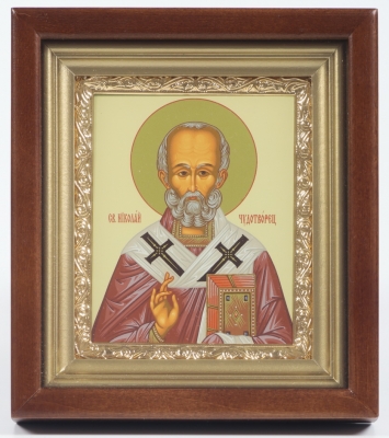Икона в киоте 11х13 сложный, темпера, рамка золочёная Николай Чудотворец