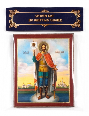 Икона на деревянном планшете 6х9 тиснение, аннотация, упаковка Александр Невский (рост)
