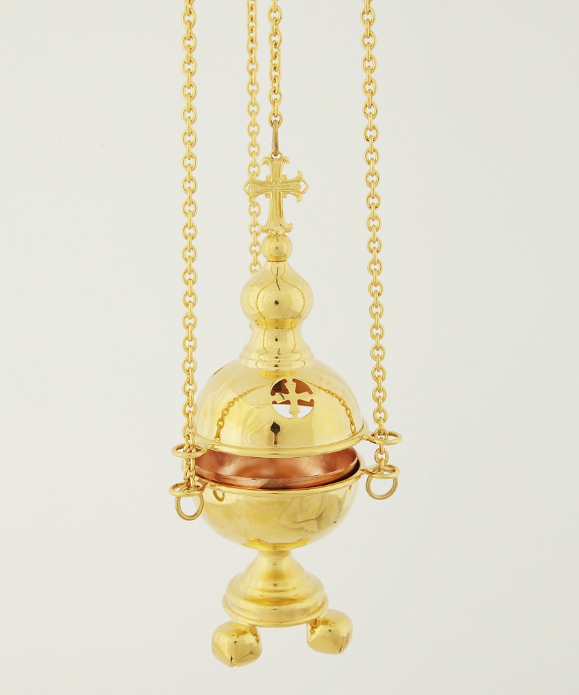 Небольшое кадило из меди и латуни в форме круглой часовни идеально подходит на роль требного кадила. Позолоченная крышка кадила украшена прорезными четырехконечными крестами, которые выполняют роль отверстия для циркуляции воздуха и выхода благовонного дыма. К изделию прилагается круглый вкладыш, защищающий кадило от загрязнений.