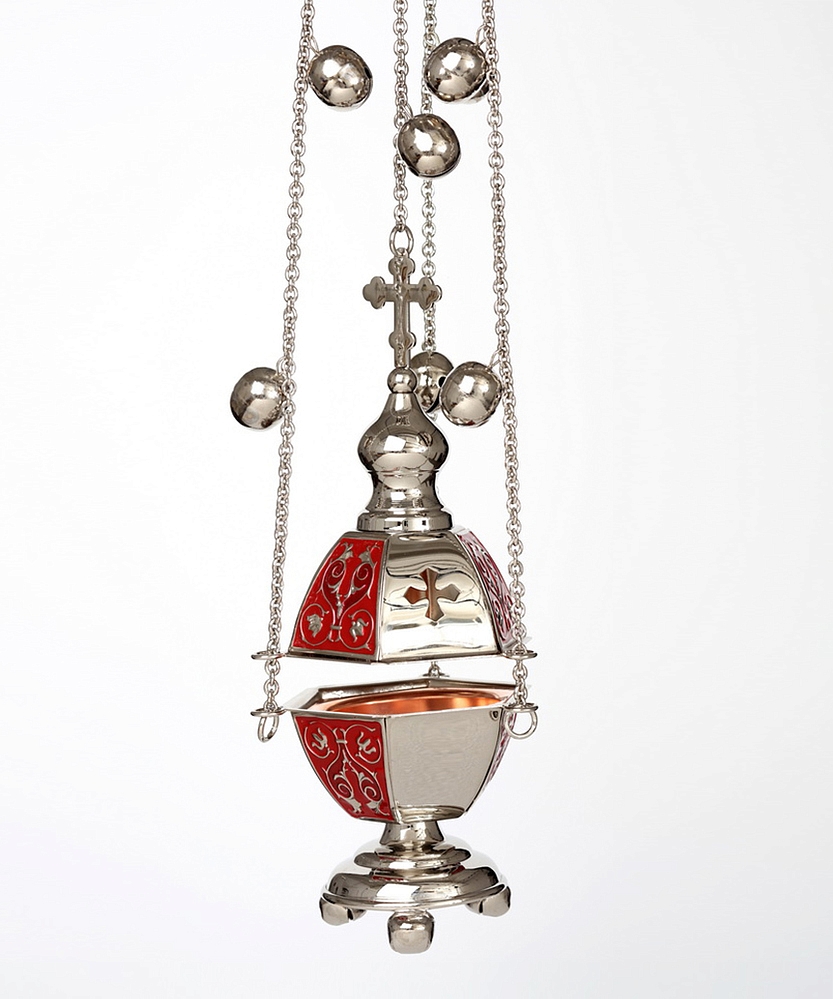 Необычное медно-латуневое кадило состоит из трех серебряных и трех ярких эмалевых граней, чередующихся между собой. Серебряные грани декорированы прорезными четырехконечными крестами, а эмалевые – тонкими растительными узорами. Крышка кадила увенчана восьмиконечным крестом. Изделие комплектуется вкладышем и позвонцами.