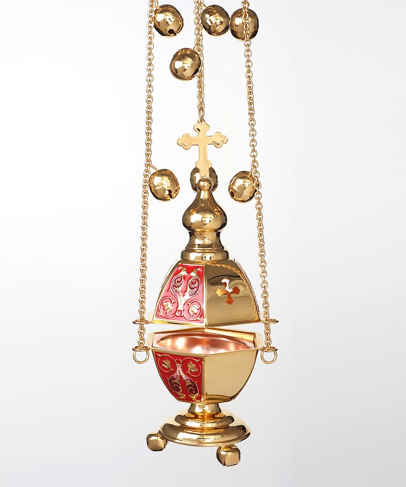 Позолоченное медно-латуневое кадило состоит из трех золотых и трех ярких эмалевых граней, чередующихся между собой. Позолоченные грани декорированы прорезными четырехконечными крестами, а эмалевые – тонкими растительными узорами. По Вашему желанию цвет эмали может быть красным, синим или зеленым. Изделие комплектуется шестигранным вкладышем и праздничными позвонцами.