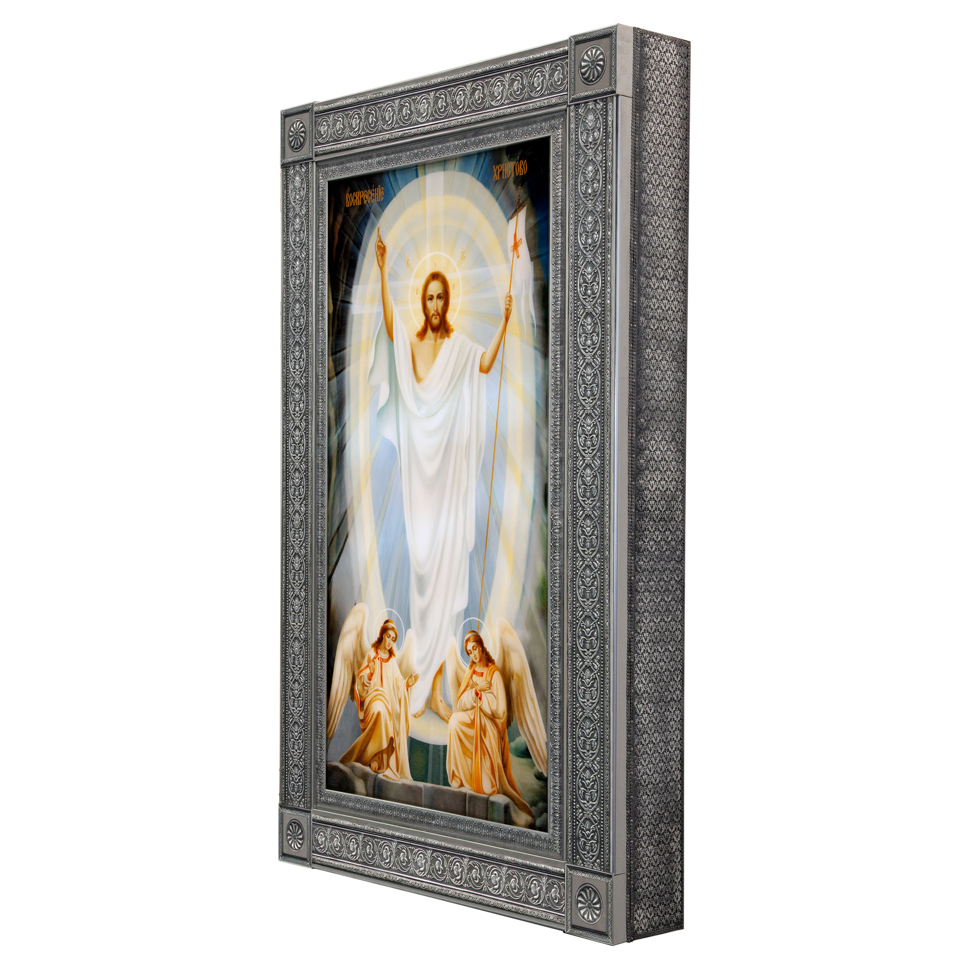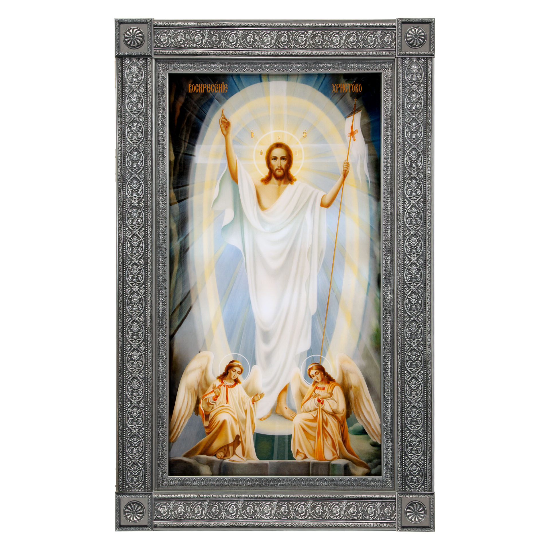 Декор - басма. Отделка гальваническое серебрение, чернение. Икона печать на стекле с подсветкой.