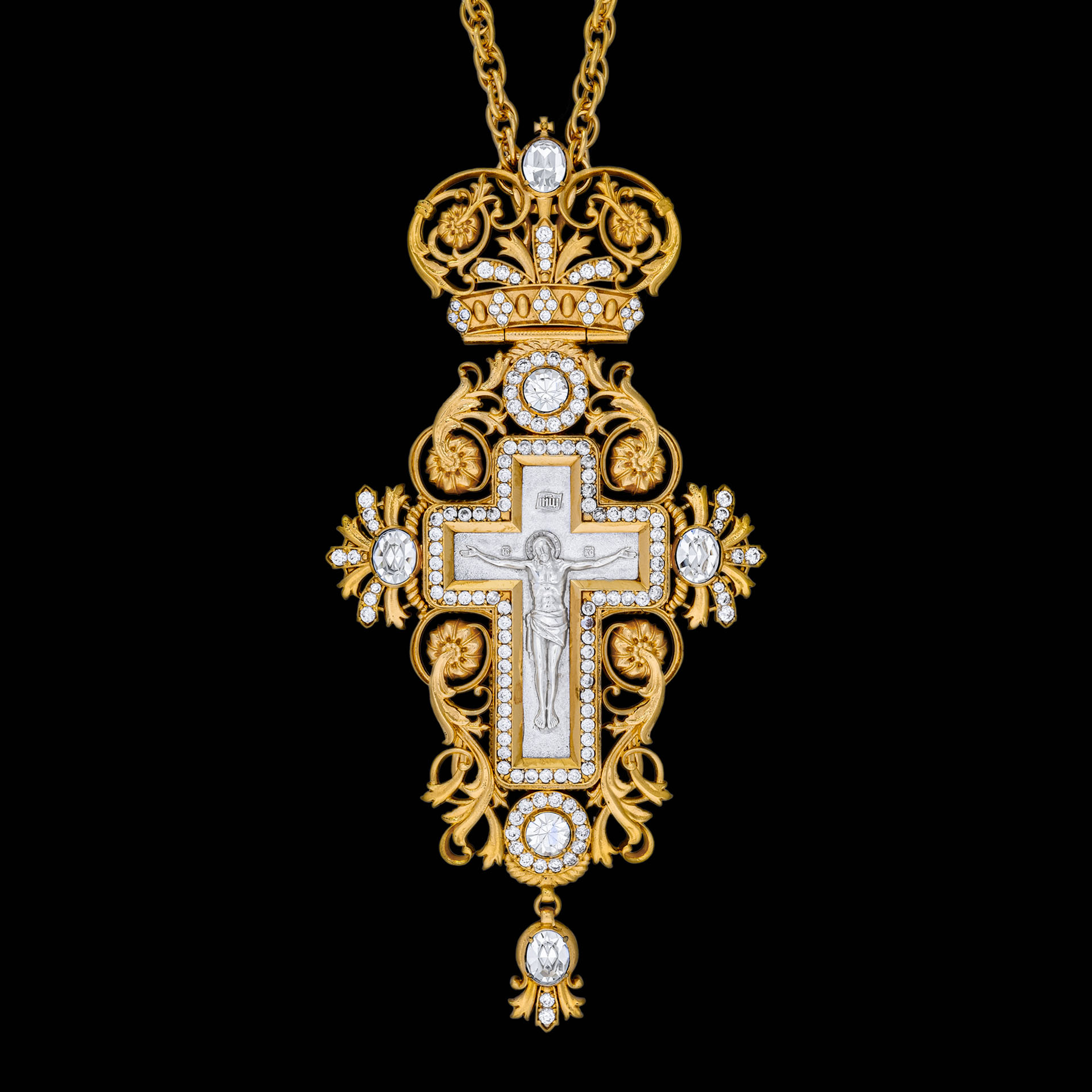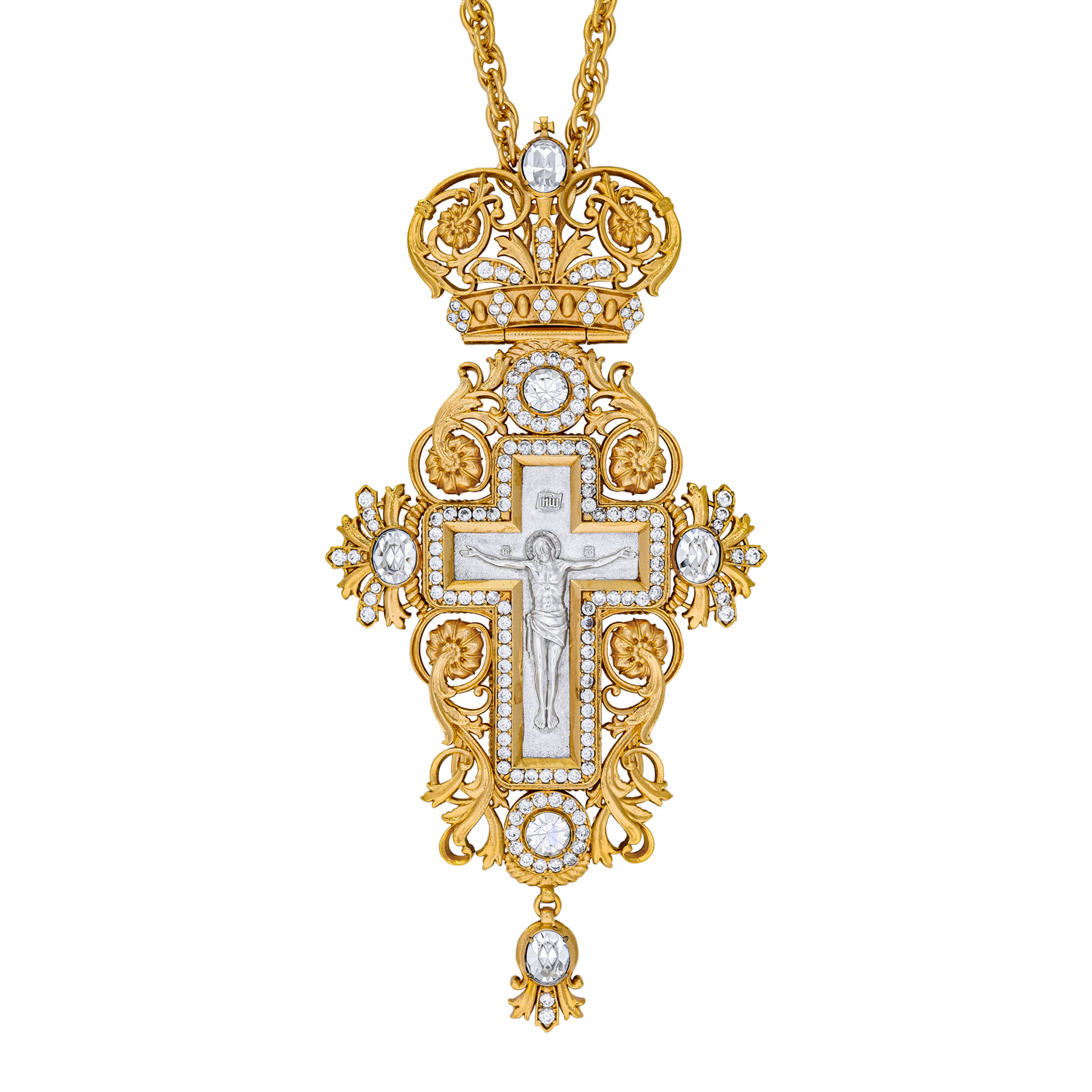 Крест архиерейский №189 / Фианиты литьевое распятие / золочение, серебрение