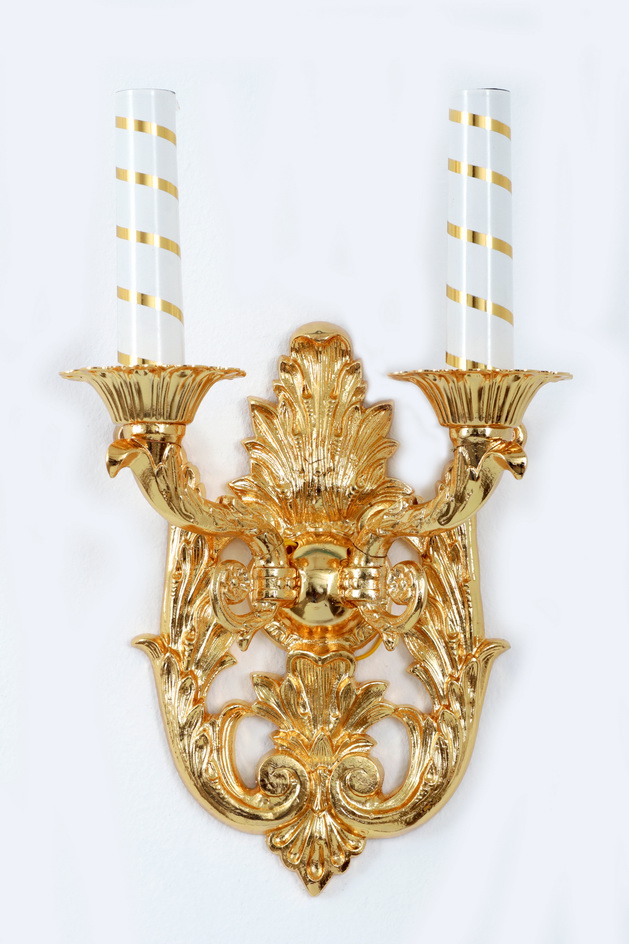 Крупная настенная лампа, представляющая собой узорчатый подсвечник с двумя свечами, имеет габариты 250х390 мм и вес 3 кг. Две белые свечи отступают от стены на 135 мм, освещая пространство храма.