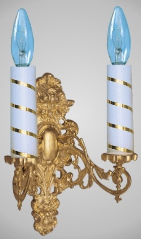 Настенная лампа в форме двух свечей, изготовленная из латуни, имеет приятный бронзовый цвет, который будет хорошо смотреться и в деревянном, и в каменном храме. Металлическая часть светильника украшена растительными узорами, выполненными в технике литья.