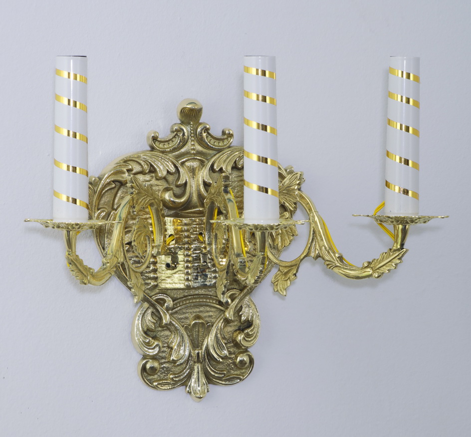 Гармоничная настенная лампа состоит из узорчатого литого основания и трех свечей, украшенных золотыми лентами под цвет основания.