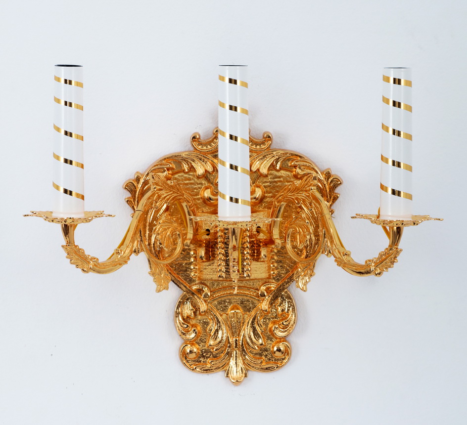 Классическая настенная лампа состоит из узорчатого литого основания и трех свечей. Благодаря тому, что расстояние между свечами довольно большое, светильник будет хорошо освещать полутемный храм.
