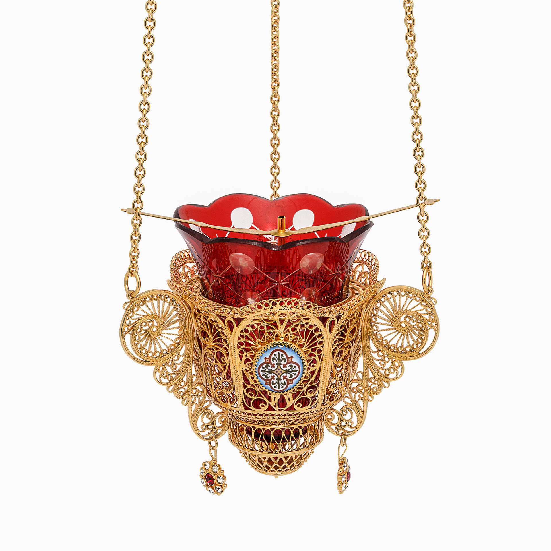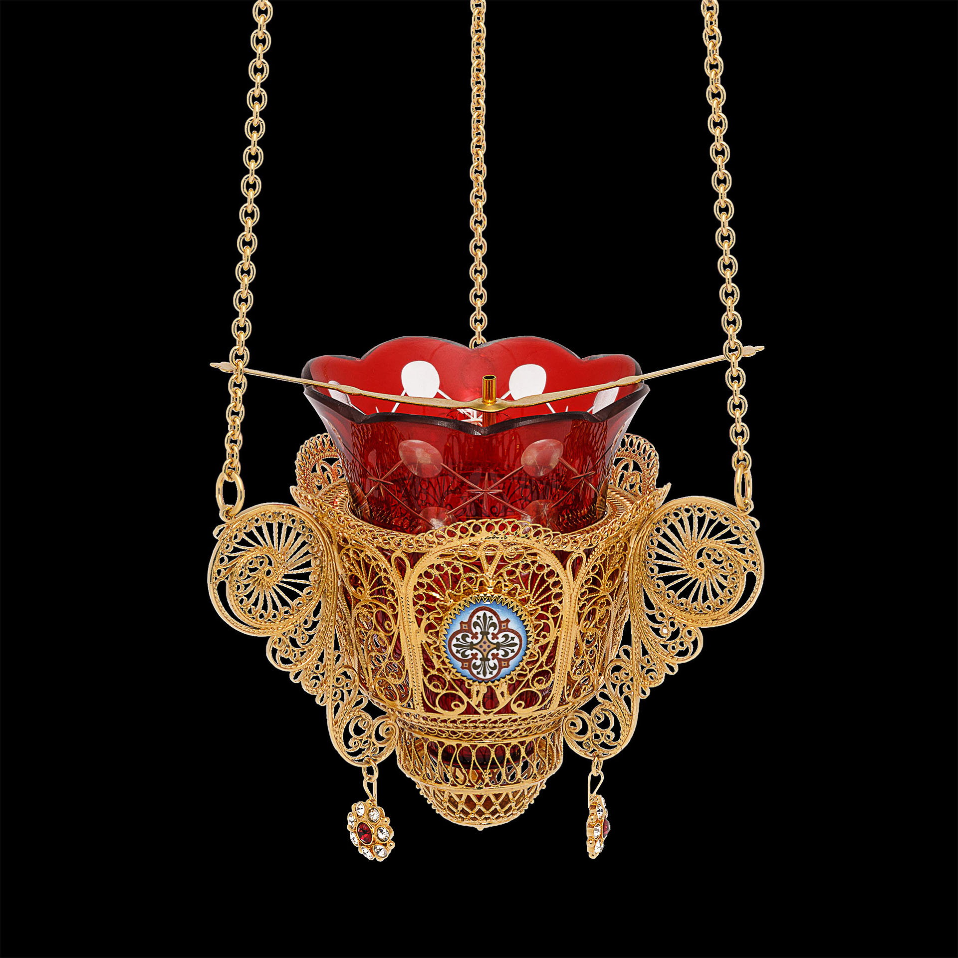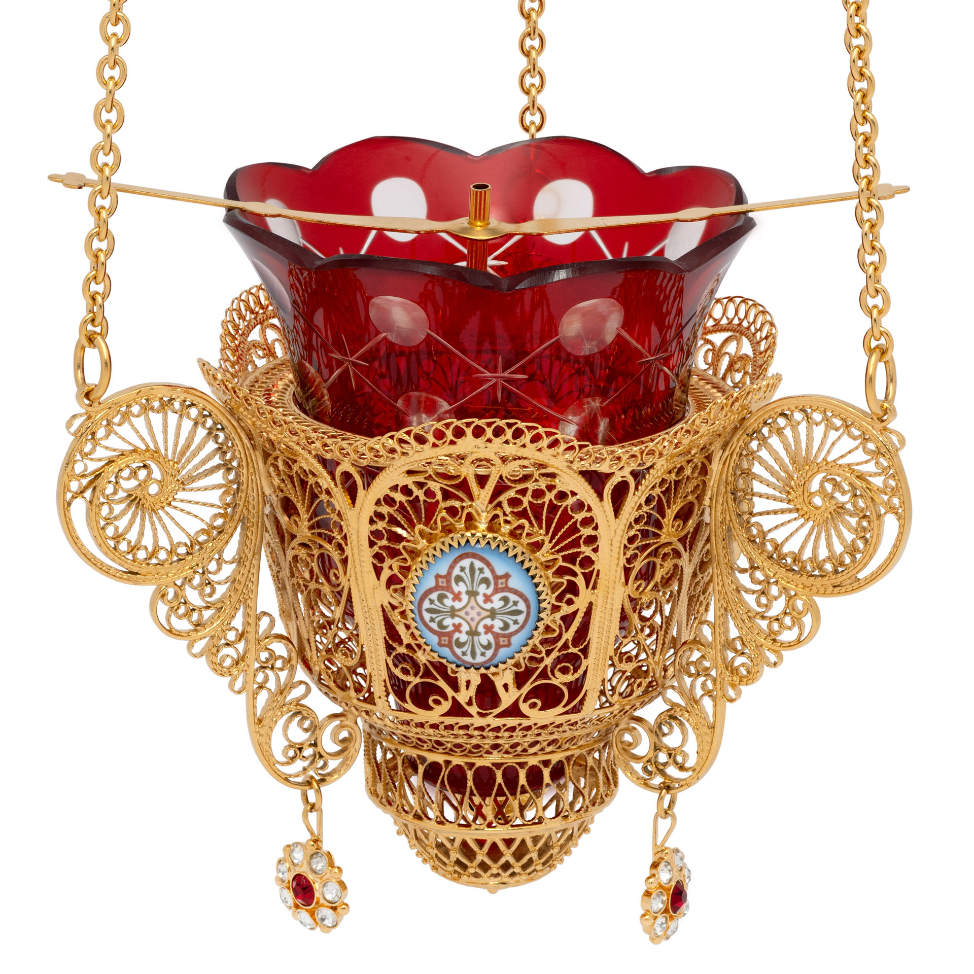 Стаканы из цветного хрусталя временно отсутствуют. Лампады можно изготовить только с прозрачным хрустальным стаканом либо со стаканом из окрашеного цветного стекла.