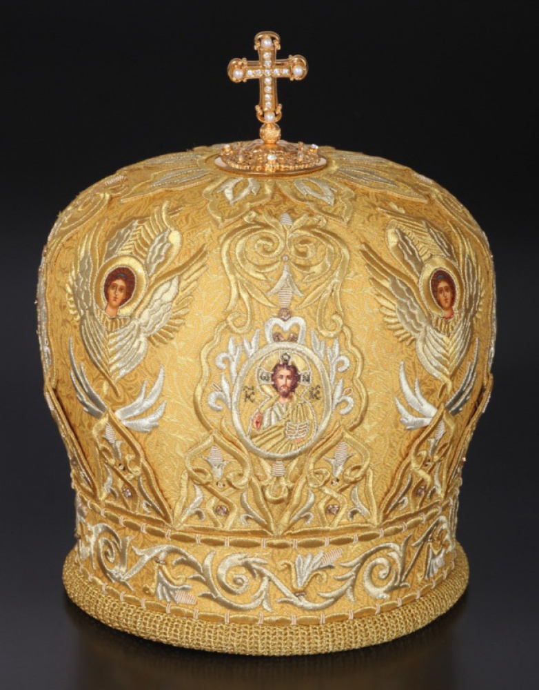 Митра с ручной вышивкой, выполнена из фактурного глазета.