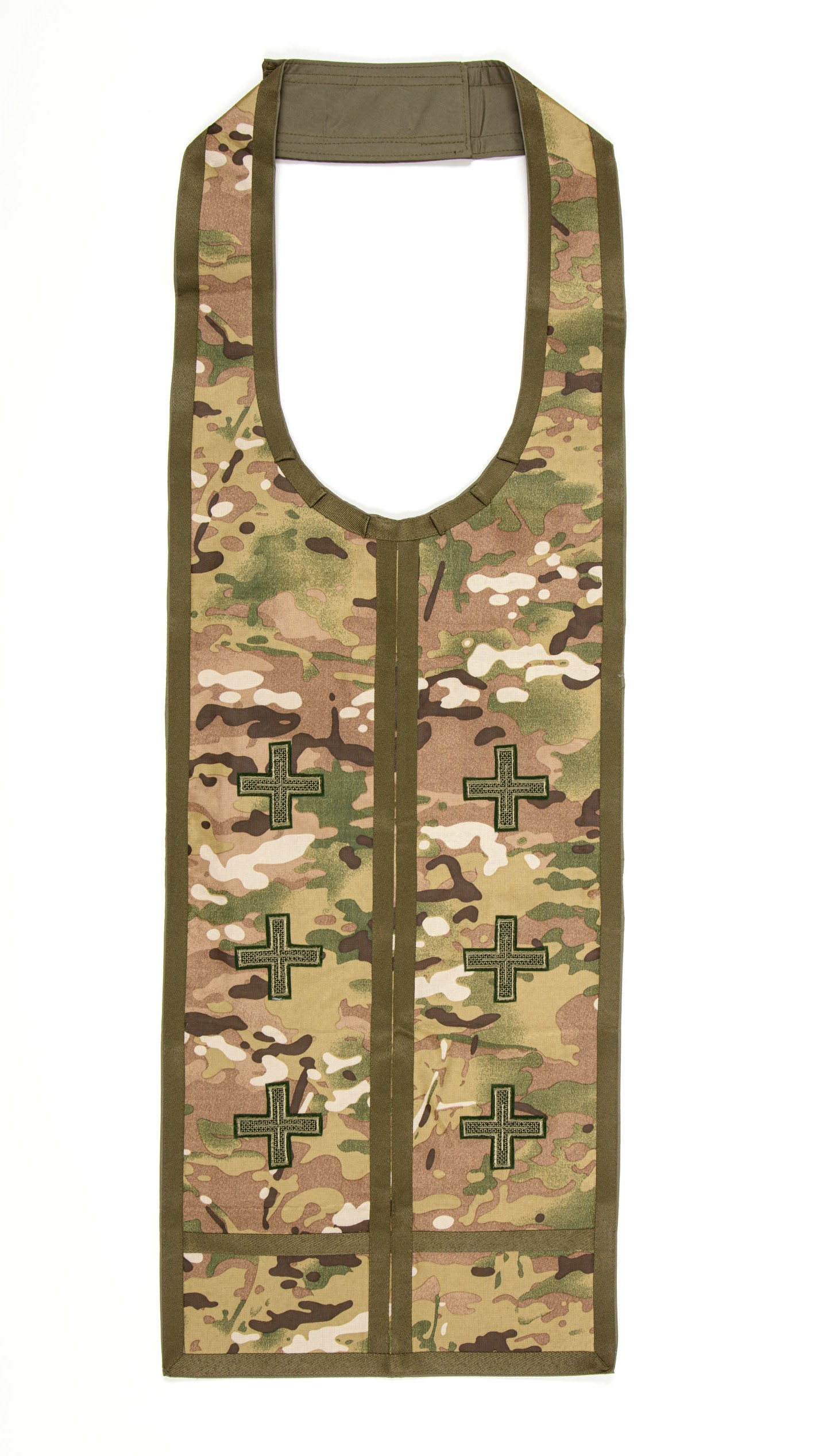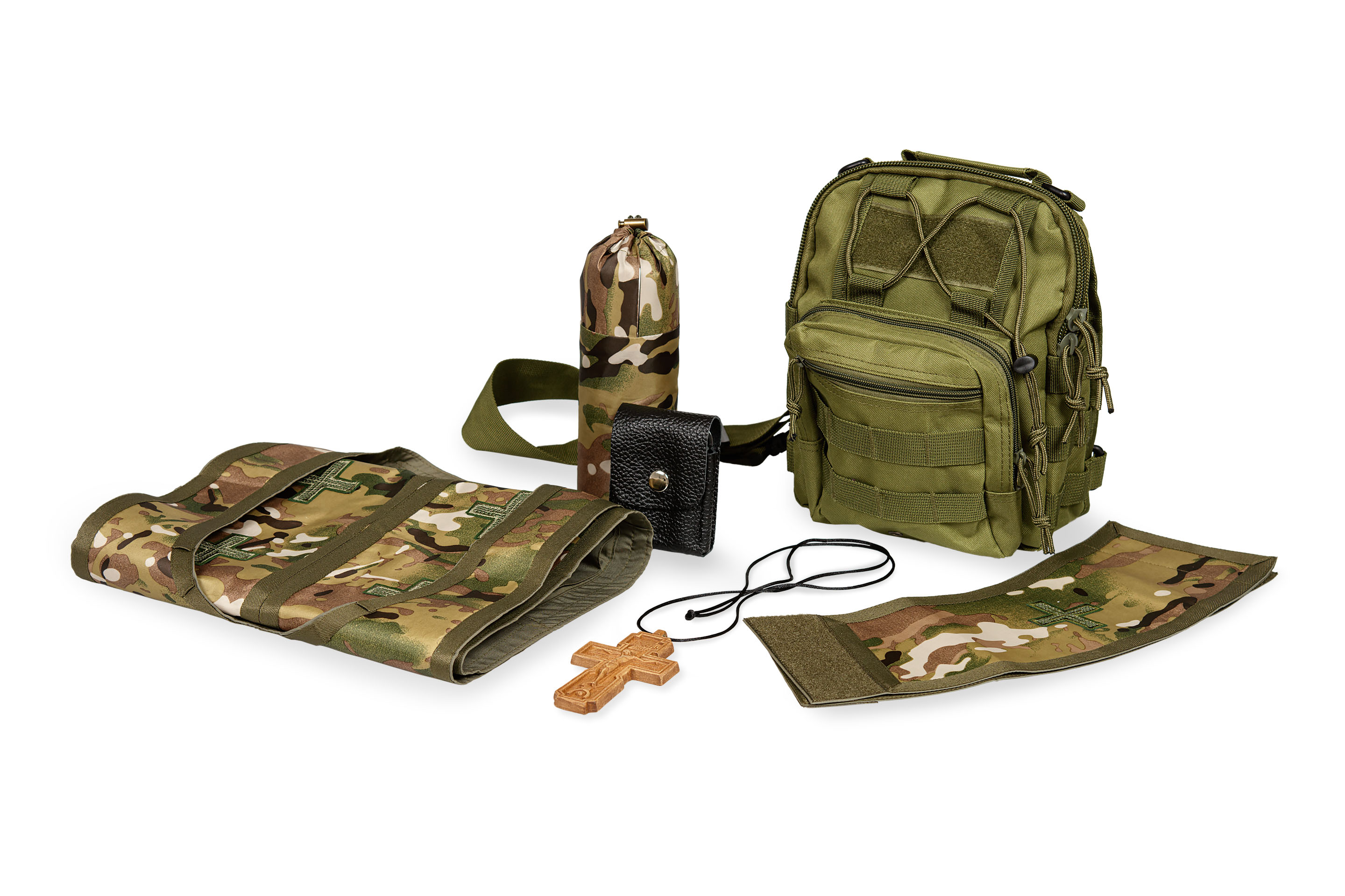 В набор входят: епитрахиль и поручи, деревянный крест, набор для крещения, походный потир, требная сумка. Облачения пошиты из прочной непромокаемой ткани цвета хаки. Наперсный крест выполнен из дерева во избежание бликов на открытом пространстве. Флаконы крестильного набора завершаются шариковым наконечником во избежание разлития и для оперативного использования.