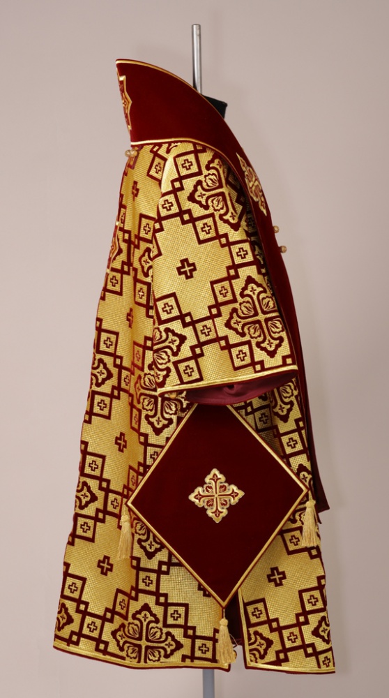 Архиерейское облачение, выполненное из натурального немецкого бархата. В комплект входит 8 предметов: саккос, епитрахиль, поручи, пояс, большой омофор, малый омофор, палица, сулок. Состав материала: 100% хлопок (Германия). Отделочные элементы: автоматическая вышивка, галун, кресты. Доступно исполнение во всех богослужебных цветах. По Вашему желанию мы можем внести изменения в отделку или заменить материал. К исполнению доступны все размеры. Подсакосник заказывается отдельно. Рекомендация по уходу за изделием: сухая химическая чистка .