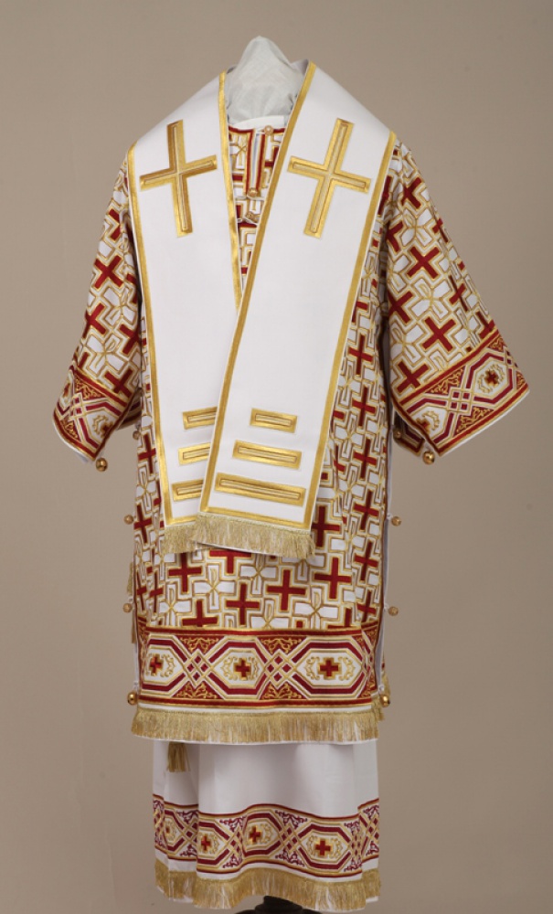 Архиерейское облачение, выполненное из натуральной костюмной ткани. В комплект входит 8 предметов: саккос, епитрахиль, поручи, пояс, большой омофор, малый омофор, палица, сулок. Состав материала: 80% шерсть, 20% полиэстер. Отделочные элементы: автоматическая вышивка, галун, кресты, бахрома. Доступно исполнение во всех богослужебных цветах. По Вашему желанию мы можем внести изменения в отделку или заменить материал. К исполнению доступны все размеры. Подсакосник заказывается отдельно. Рекомендация по уходу за изделием: сухая химическая чистка .