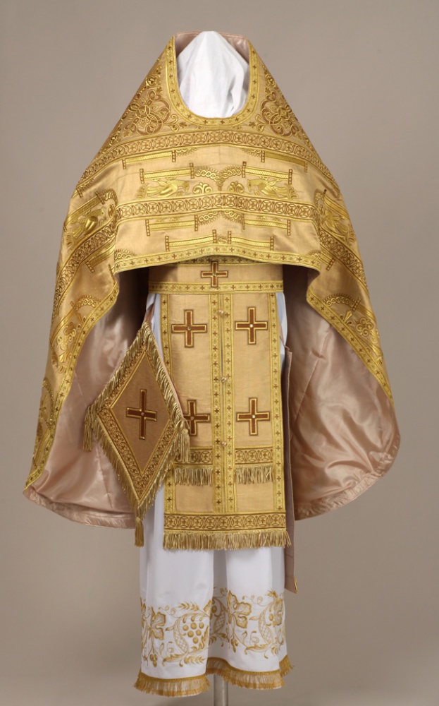 Облачение, выполненно из лионского шелка. В комплект входит: фелонь, епитрахиль, поручи, пояс, набедренник, палица.