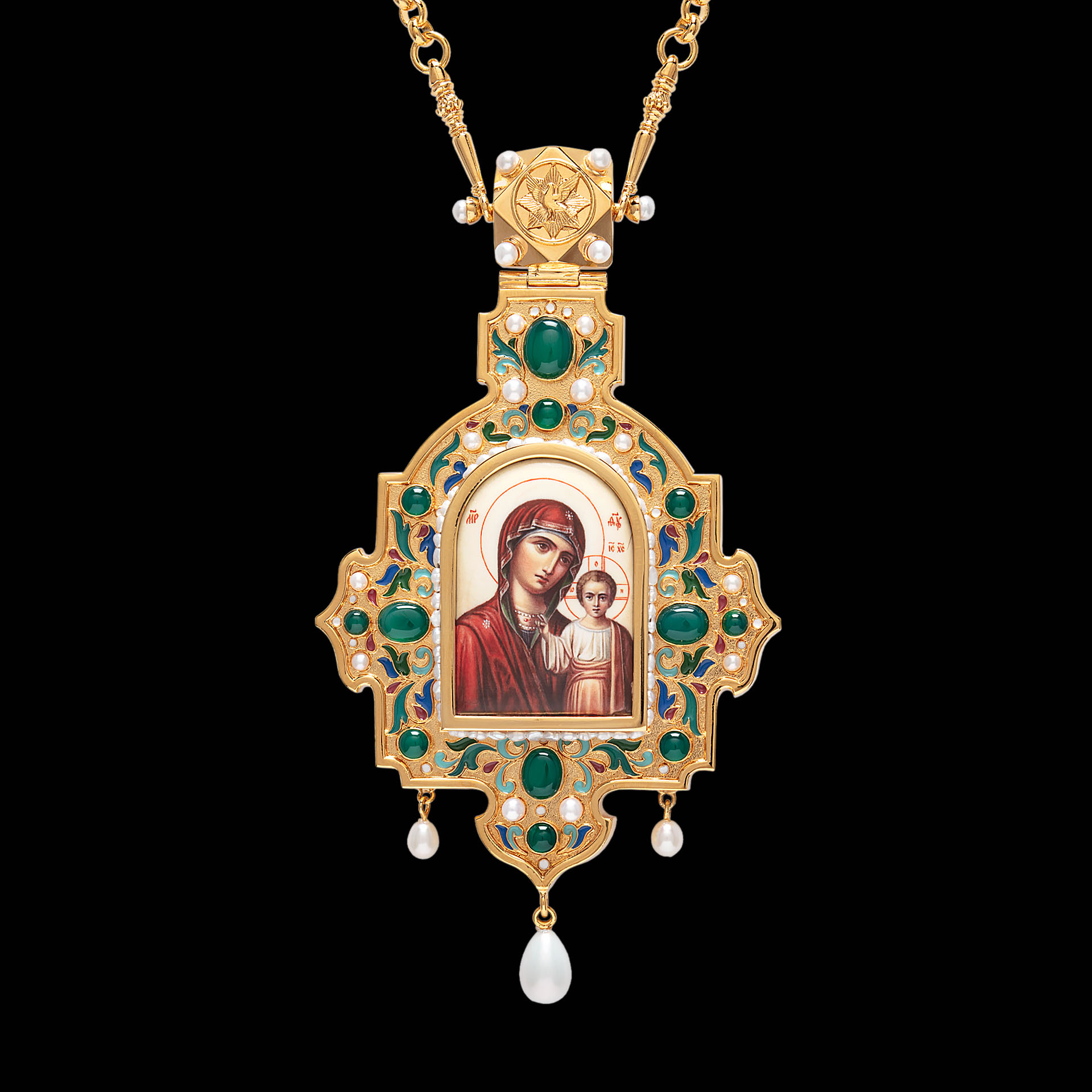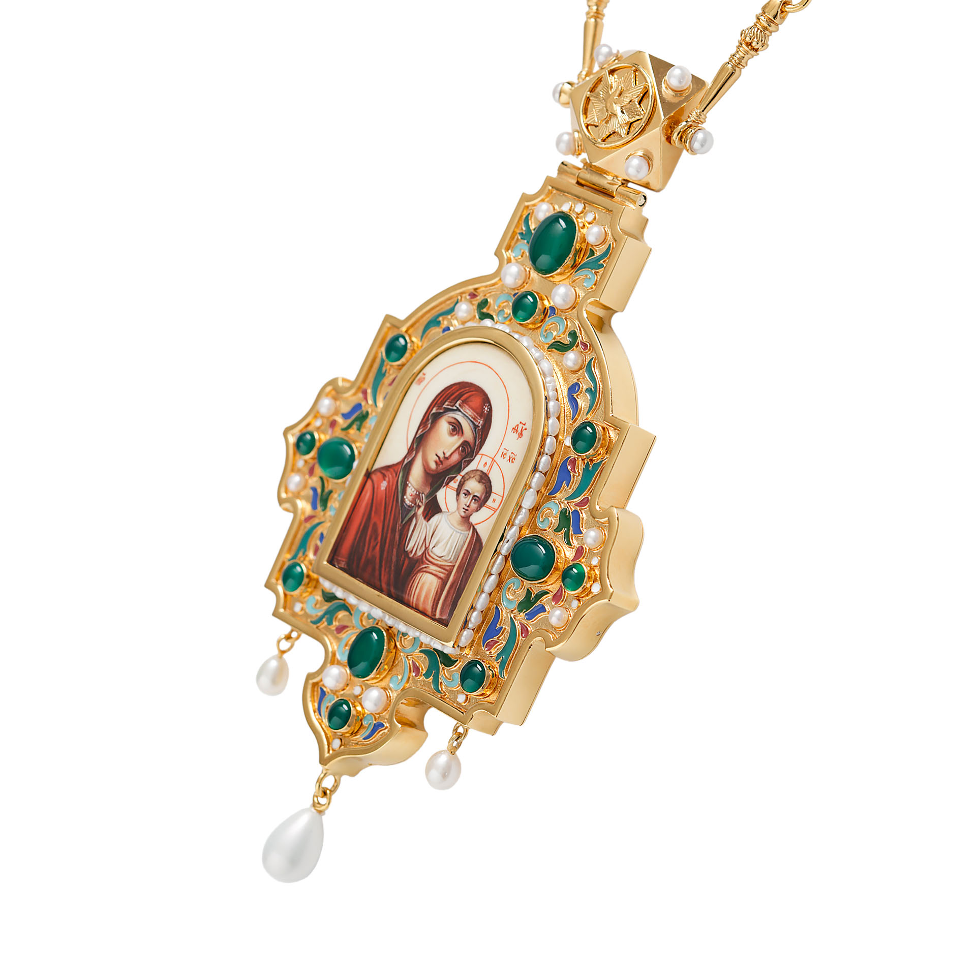 Панагия №1415 / Фианиты деколь, эмаль / золочение / Казанская БМ
