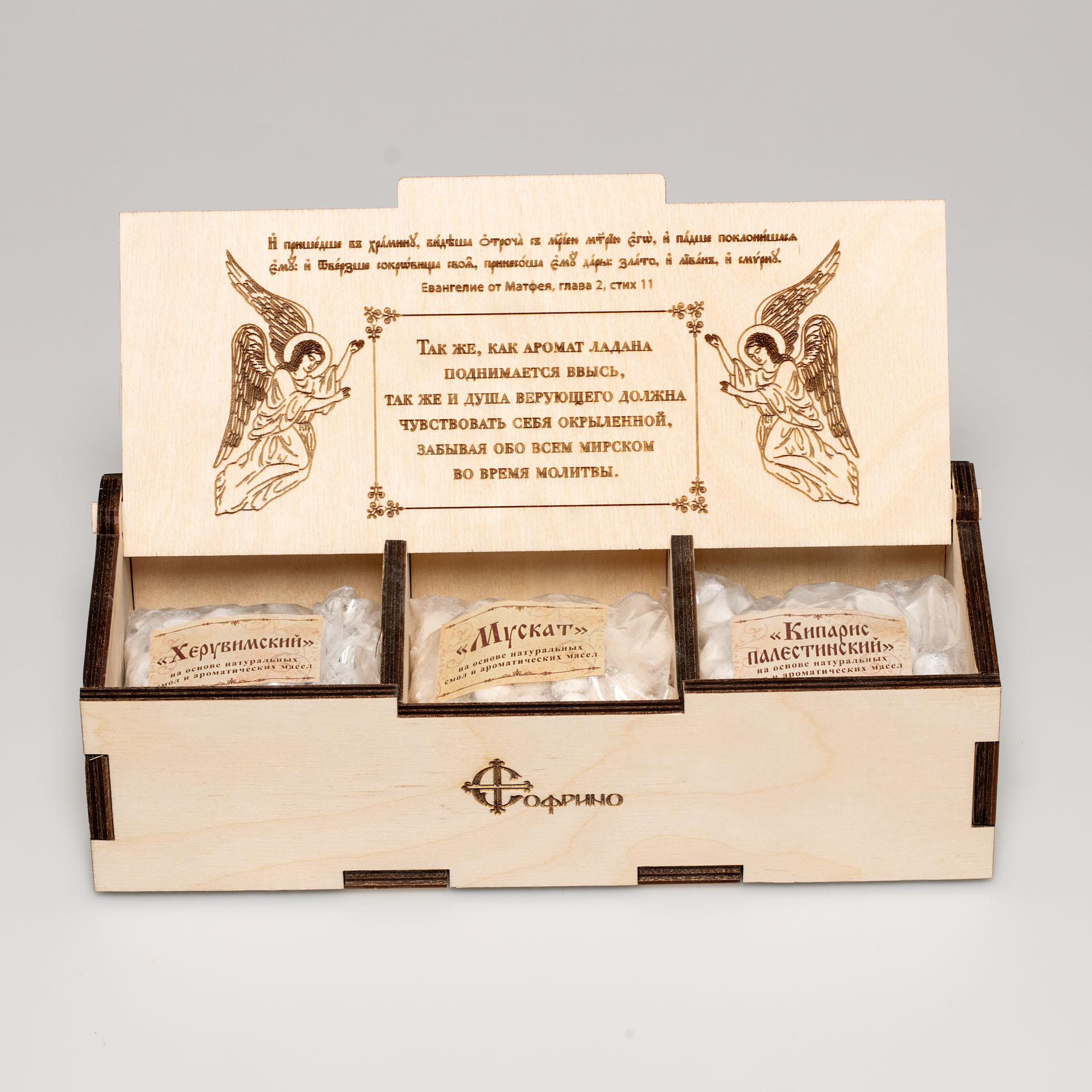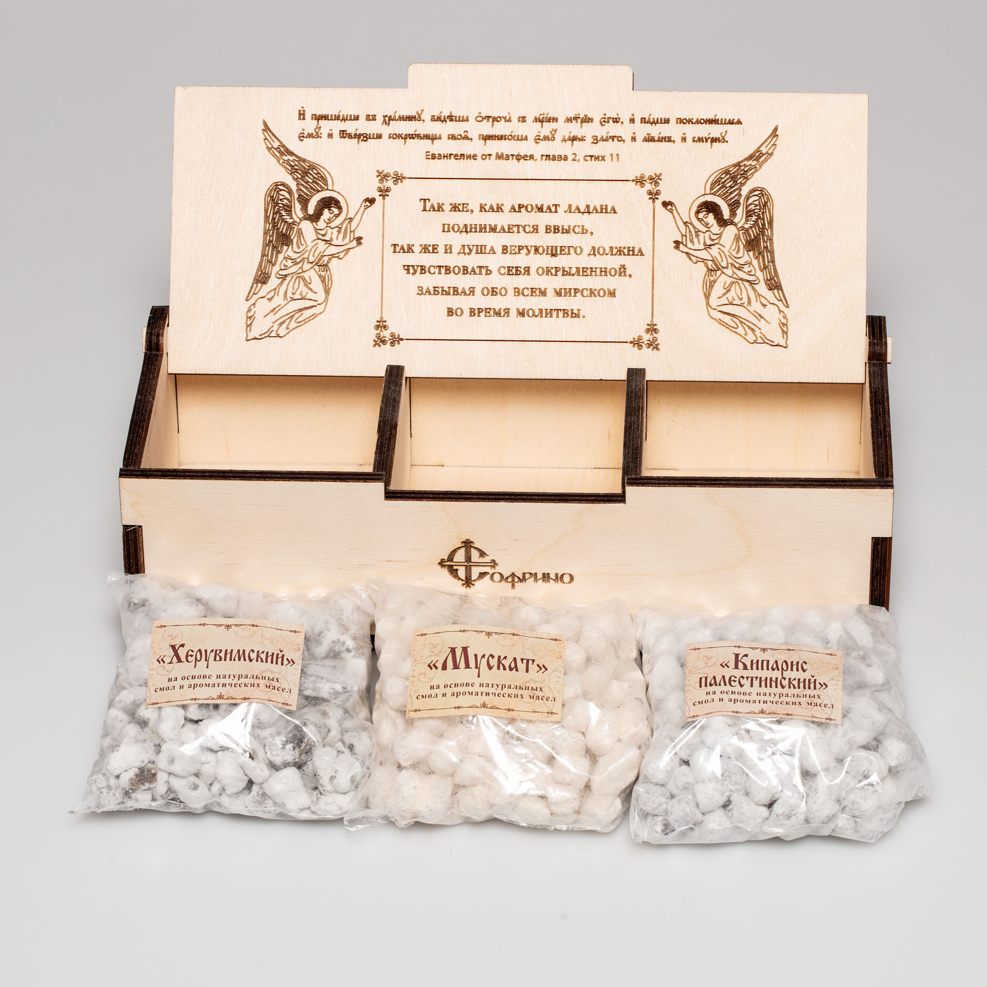 Подарочный набор №5 / 1 (шкатулка деревянная с ангелами, ладан 3 уп х 100 гр)