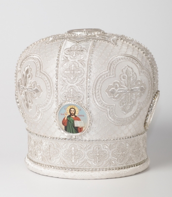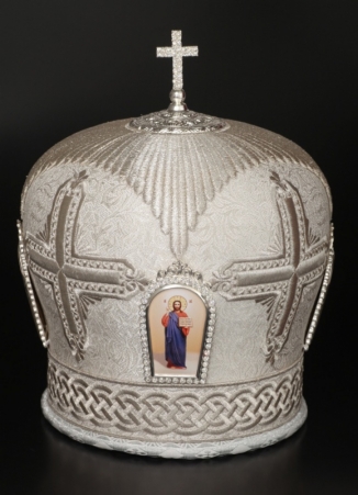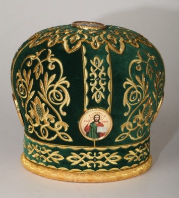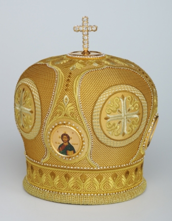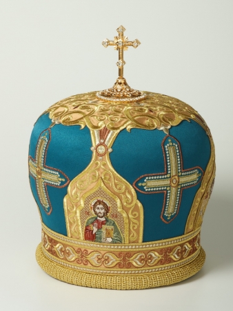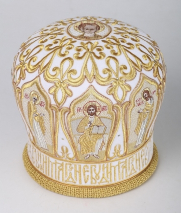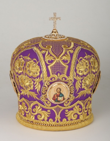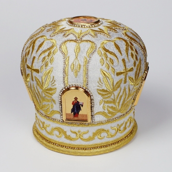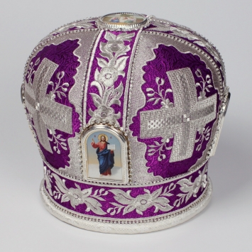 Митра ручная вышивка №542 глазет 4 вышитые иконы, крест юв.в футляре