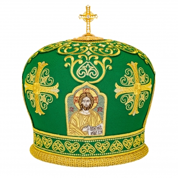 Митра ручная вышивка №551 габардин, канитель, юв.камни, лики вышитые 4 шт., юв.крест , футляр(п)