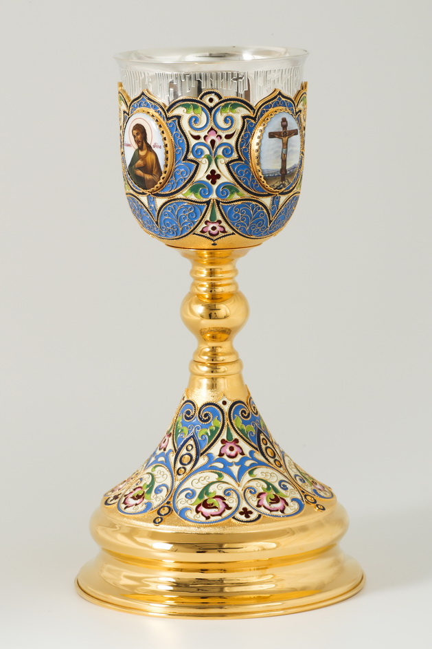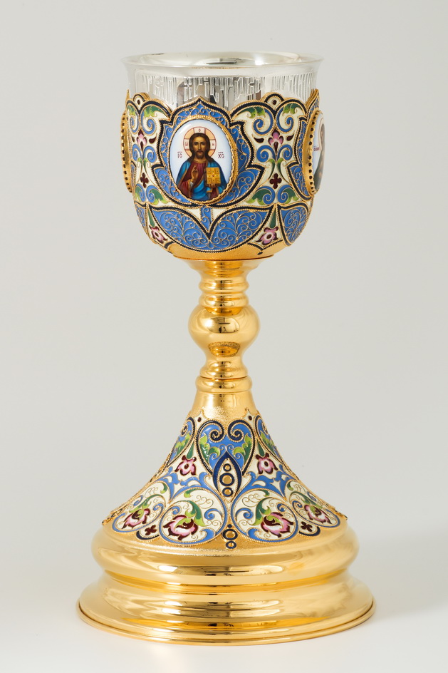 Потир 0.75л 4-финифти, филигрань, эмаль, роспись / поддон 1,5л потира / золочение / серебряный стакан (УИН)