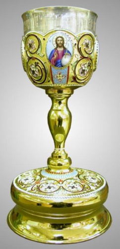 Потир 1,0л 4-финифти, филигрань, эмаль, роспись / поддон старого образца / золочение / серебряный стакан (УИН)