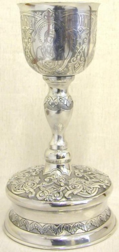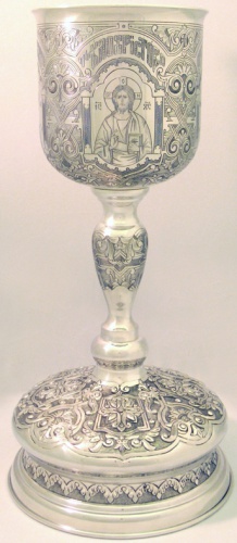Потир 1.0л ручная гравировка с 4мя-ликами, чеканка / поддон старого образца / серебро (УИН)