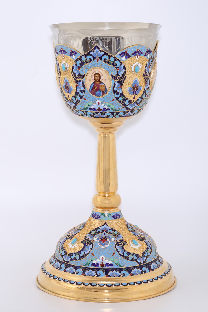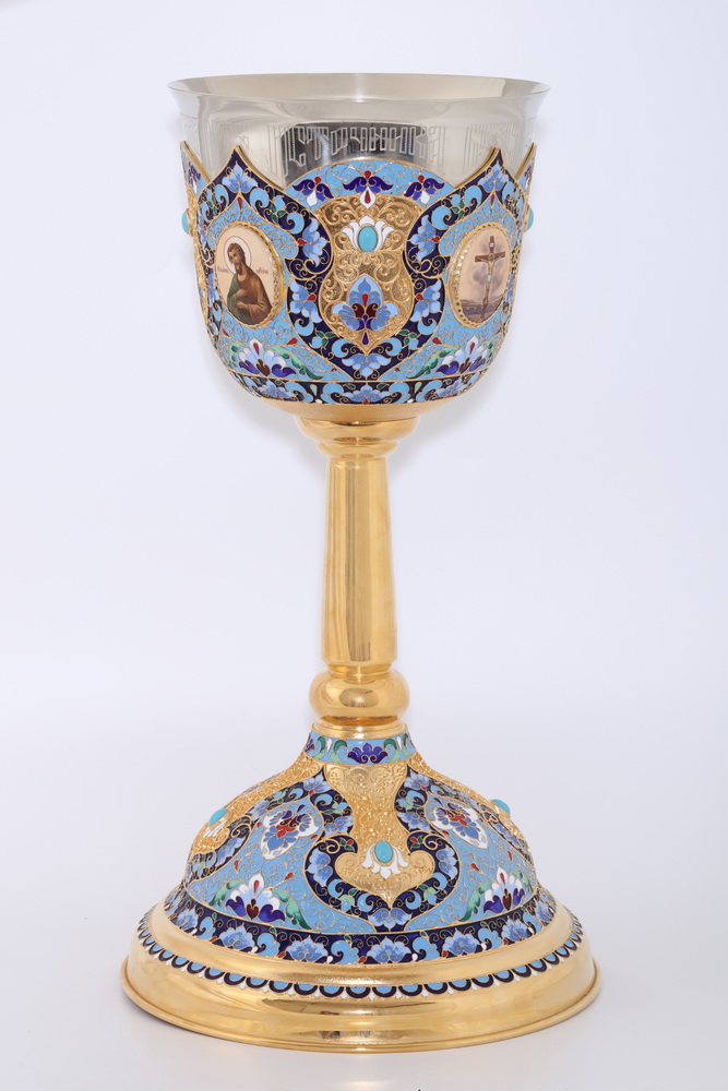 Изящный медно-латуневый потир, обвитый эмалевыми цветами, станет настоящим украшением богослужения, особенно в дни поминовения Пресвятой Богородицы, когда все духовенство будет облачено в голубые одежды. По краю чаши методом лазерной гравировки написаны слова молитвы, которая поется во время причащения мирян: «Тело Христово приимите, Источника Безсмертного вкусите». Также чаша украшена четырьмя иконами-медальонами с изображениями Христа, Божией Матери, Иоанна Предтечи и Распятия, выполненными методом финифти. Во избежание появления темных пятен на изделиях из мельхиора требуется его надлежащая эксплуатация и уход. Чтобы избежать потемнения изделий из мельхиора, следует сразу после мытья насухо протирать метал мягкой тканью. Каждая капля воды, высохшая на поверхности из мельхиора естественным путем, оставит после себя темную окись.