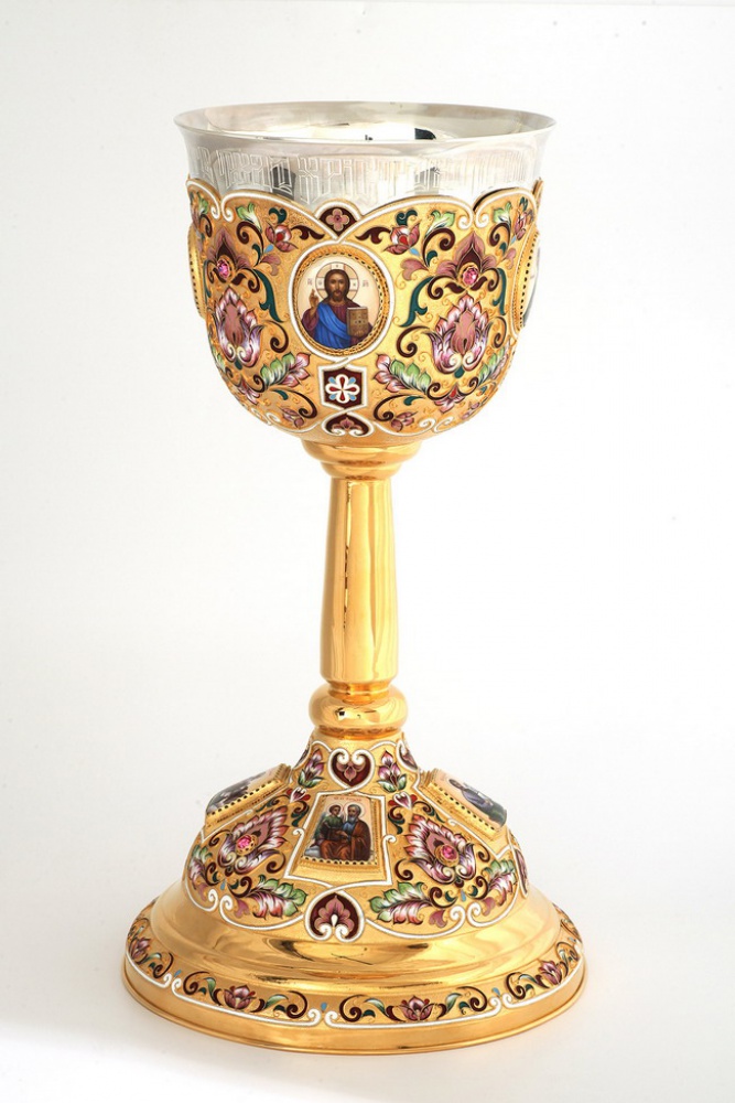 Потир 3.0л 8-финифтей, филигрань, эмаль, роспись, чеканка "№6" / золочение / серебряный стакан (УИН)