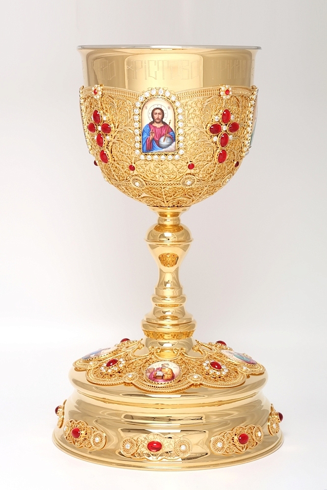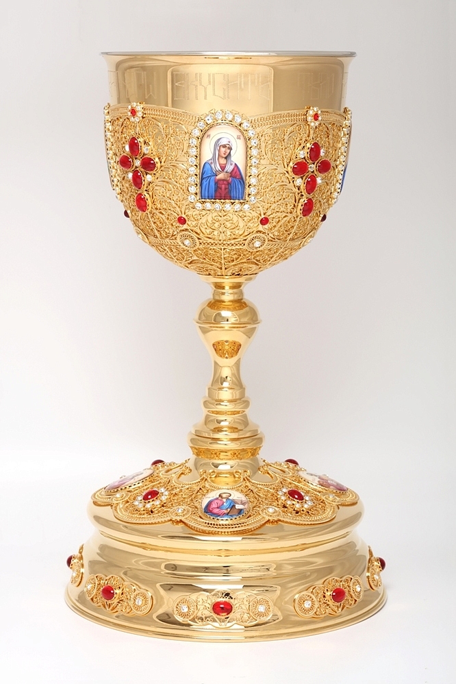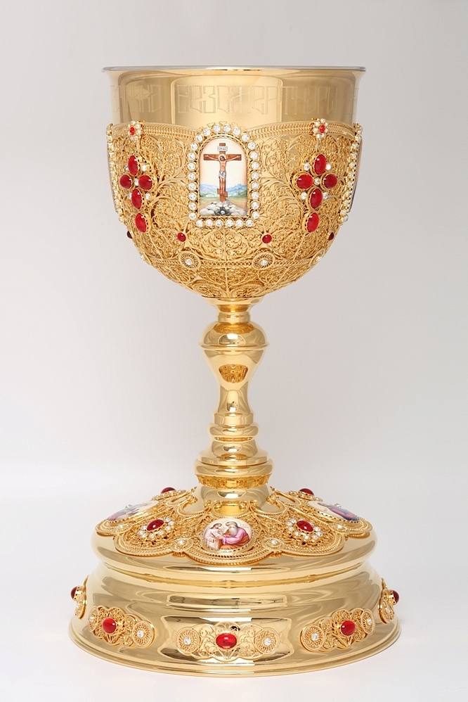 Царственный и минималистичный, потир имеет объем 5 л. На золотом фоне, представляющем собой тонкое филигранное кружево, ярко выделяются четыре финифти с изображениями Христа, Божией Матери, Иоанна Предтечи и Распятия, а также объемные кресты камней. Размеры потира составляют 510х305х510 мм. Во избежание появления темных пятен на изделиях из мельхиора требуется его надлежащая эксплуатация и уход. Чтобы избежать потемнения изделий из мельхиора, следует сразу после мытья насухо протирать метал мягкой тканью. Каждая капля воды, высохшая на поверхности из мельхиора естественным путем, оставит после себя темную окись.