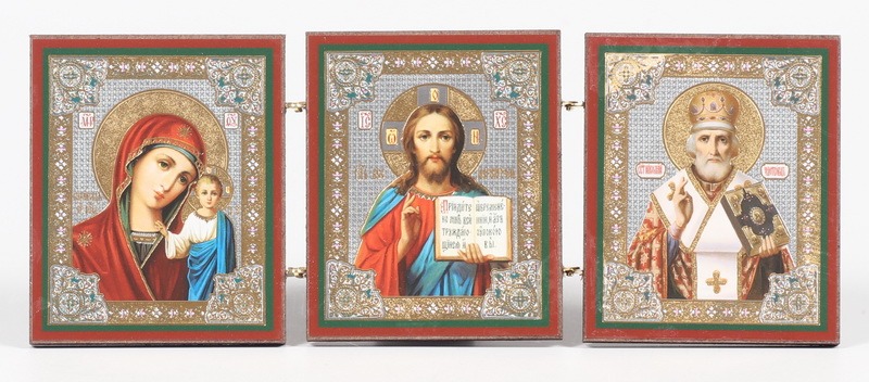 Складни деревянные 7х18 трехстворчатые, двойное тиснение Спаситель-Казанская БМ-Н.Чудотворец 14