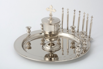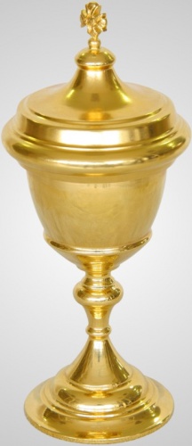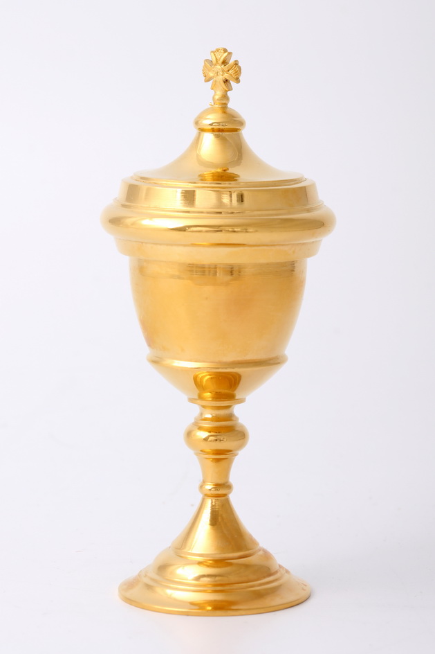 Маленький потир размером 55х120 мм предназначен для переноса Святых Даров в больницы и дома болеющих прихожан. Чаша герметично закрывается крышкой, украшенной четырехконечным крестом. Изделие упаковано в картонную коробку размером 165х95х65 мм.