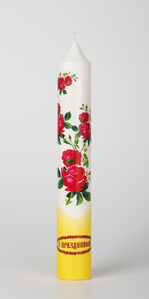 Диаконская свеча выполнена из парафина , её украшает яркая деколь, и поздравительная надпись.
