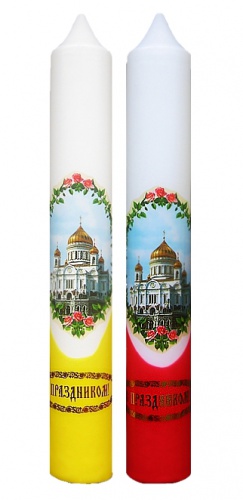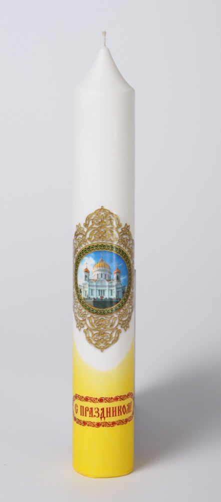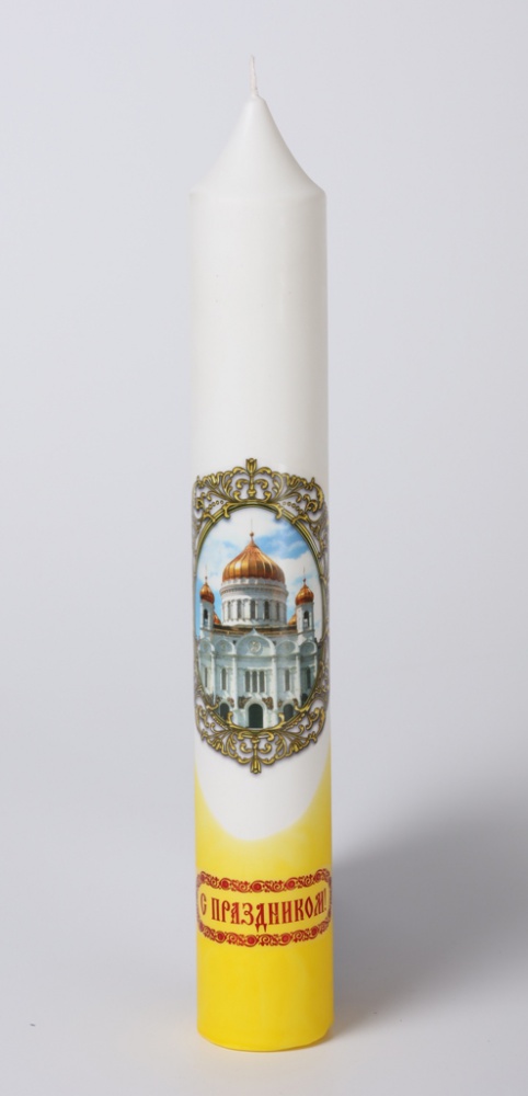 Диаконская свеча выполнена из парафина , её украшает яркая деколь, с изображением Храма Христа Спасителя и поздравительная надпись.