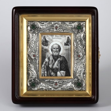 Икона финифть в чеканной ризе 18*24 серебро / киот / золочение / Николай Чудотворец (УИН)