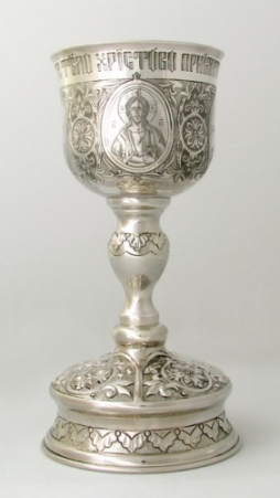 Потир 0.5л ручная гравировка с 4-мя ликами, чеканка / поддон старого образца / серебро (УИН)