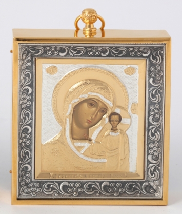 Икона штампованная 6*7 / темпера / золочение / серебро в металлическом киоте Казанская БМ (УИН)